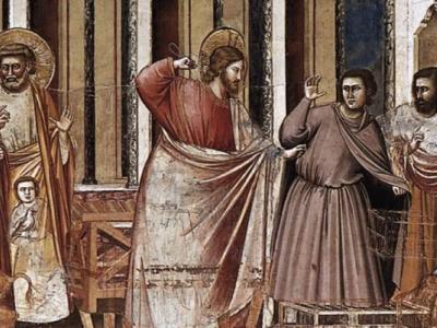 يدخل يسوع الهيكل وينظر إلى كل ما يدور في الهيكل من بيع وشراء: أناس يبيعون الحيوانات اللازمة لتقديم الذبائح، الحيوانات نفسها، والصيارفة.