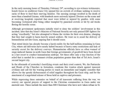 وطالب البطاركة ورؤساء الكنائس بوقف فوري وممتد لإطلاق النار، وبتسريع عملية توزيع المساعدات الإنسانية في كافة أرجاء قطاع غزة،وبالبدء في مفاوضات لإطلاق سراح الأسرى والمعتقلين.