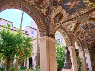 وتُظهر بعض اللوحات الجدارية التي تزيّن الجدران والأسقف المقوّسة أسرار المسبحة الوردية، وقد صُمّمت لتشجيع حياة التأمل لدى الرهبان الدومينيكان. بينما تكشف لوحات أخرى، موزّعة في الزوايا والمداخل، عن تاريخ مضطرب شهدته هذه المساحة.