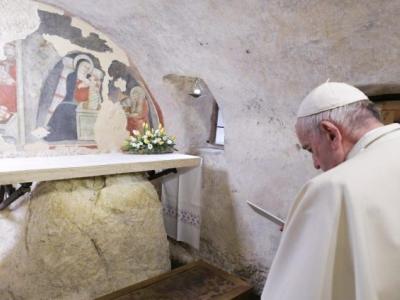 أضاف الأب الأقدس يقول يصف أول كاتب سيرة للقديس فرنسيس، توماسو دا شيلانو، ليلة عيد الميلاد عام ١٢٢٣، والتي نحتفل هذا العام بالذكرى المئوية الثامنة لها. عندما وصل القديس فرنسيس، وجد المذود مع التبن والثور والحمار. وأظهر المتجمعون فرحة لا توصف، لم يسبق لها مثيل، أمام مشهد عيد الميلاد. ثم احتفل الكاهن على المذود بالإفخارستيا، موضحًا العلاقة بين تجسد ابن الله والإفخارستيا. وفي تلك المناسبة، في غريتشو، لم يكن هناك أي تمثال: بل كوّن مغارة الميلاد وعاشها جميع الذين كانوا حاضرين هناك.