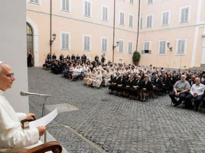 افتتح الأب الأقدس كلمته بتقديم الشكر على عملهم "وعلى حضورهم الأمين" في الكثير من مناطق العالم، مشيرًا إلى أنّ مؤسّسيهم ومؤسّساتهم "وفي طاعة لعمل الروح القدس، قد تركوا لهم كإرث كاريزما ومواهب متنوعّة من أجل بناء جسد المسيح".