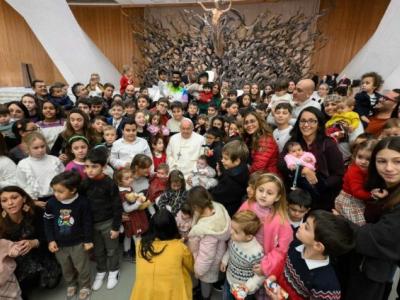 تابع الأب الأقدس يقول ثانياً: العائلة. إنه لمن دواعي السرور أن أراكم هنا معًا، ومع أطفالكم. لقد كان القديس يوحنا بولس الثاني يقول إن العائلة بالنسبة للكنيسة هي مثل "مهدها". وهذا صحيح: فهي، في الواقع إذ تقوم وتتجذَّر في سر الزواج، تشكل المكان الذي تُولد فيه الحياة – وكم هو مهم اليوم قبول الحياة! –. كما أنها الجماعة الأولى التي نلتقي فيها، منذ الطفولة، بالإيمان، وكلمة الله والأسرار المقدسة، وحيث نتعلم أن نعتني ببعضنا البعض وأن ننمو معًا في المحبة، في جميع الأعمار. لذلك أشجعكم – آباء وأبناء وأجداد وأحفاد – على أن تبقوا دائمًا متّحدين ومتماسكين مع بعضكم البعض وحول الرب: في الاحترام، وفي الاصغاء، وفي العناية المتبادلة. وأوصيكم أيضاً بأن تصلّوا معاً، لأن العائلة لا يمكنها أن تستمر بدون صلاة. وفي هذا الصدد، أقترح عليكم خلال هذه الأيام أن تجدوا بضع لحظات تجتمعون فيها حول المغارة لكي ترفعوا الشكر لله على نعمه، وتطلبوا مساعدته للمستقبل، ولكي تجددوا محبتكم لبعضكم البعض أمام الطفل يسوع.