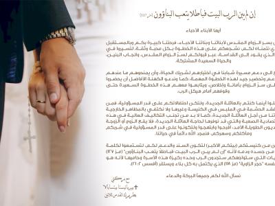 ندعو الجميع إلى دعم مسيرة شبابنا في إختيارهم لشريك الحياة، وأن يمنحوهم ما عندهم من نصح ودعم وتحضير جيّد لهذه الخطوة المهمة، كما وندعو الكهنة الأفاضل أن يحضروا المقبلين عن سر الزواج بأمانة وإخلاص، ويتابعوا معهم هذه الخطوة السعيدة حتى وقوفهم أمام هيكل الرب.