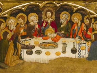 وفسَّر رمزيّة الطاولة التي تضمّ خبزًا وخمرًا وشموعًا وسكّينًا كبيرًا، وقطعة خبز أمام كلّ تلميذ. فالخبز يُشير إلى جسد الربّ، والخمر إلى دمه، دم العهد الجديد، والشموع إلى حضور النور الإلهيّ وتأكيدًا للبُعد الليتورجيّ (القدّاس). وتابع: «أمّا السكّين فهو لأجل الذبيحة، وفيما يظهر الحَمَلُ الفصحيُّ على المائدة في بعض الأيقونات، ففي هذه يسوع هو الحَمَل، والسكّين هنا هي إشارة إلى ذبيحته على الصليب. فالمائدة إذن ليست مجرّد طعام، بل هي علامة الاحتفال الليتورجيّ الذي سيجعل التلاميذ في شركة دائمة مع معلِّمهم، بتناولهم الخبز والخمر».