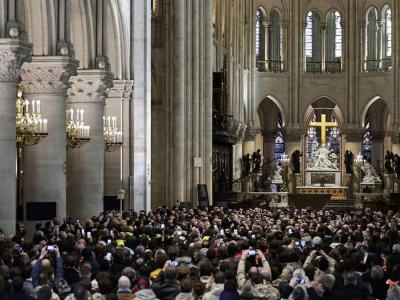 ووصف ماكرون فتح أبواب نوتردام مجددًا في 7 كانون الأول بأنه إلى جانب دورة الألعاب الأولمبية التي استضافتها باريس خلال الصيف الماضي "من دواعي افتخار" فرنسا. وأشاد ماكرون في كلمته خلال تفقد الكاتدرائية الجمعة بـ"المهارة الفرنسية"، وبـ"النجاح الجماعي".