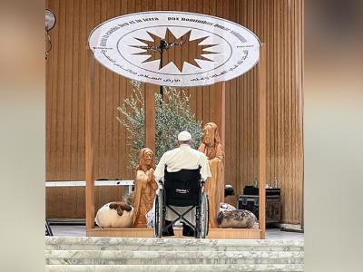 ابونا - وضعت في قاعة بولس السادس في حاضرة الفاتيكان، مشهد الميلاد للمصممين من مدينة بيت لحم جوني أندونيا وفاتن نسطاس متواسي، بهدف التذكير بأنّ الأرض المقدسة "هي المشهد اليومي للدمار والصراع والحزن والعنف"، كما جاء في بيان للفاتيكان.