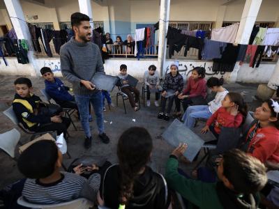 غزة- نبض الحياة: رصف مدرّس اللغة الإنجليزية طارق العنابي مقاعد أخرجها من مخزن مدرسة تحوّلت مركزًا لإيواء النازحين في قطاع غزة، وجلس إليها أطفال يحاولون معه استعادة بعضٍ من حياة طبيعية خسروها منذ بدء العدوان الإسرائيلي على قطاع غزة في السابع من تشرين الأول/أكتوبر الماضي.